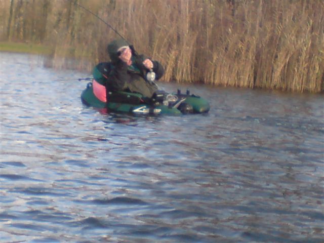 Dus het door Jan aangeboden kopje koffie zo heet mogelijk genuttigd, Belly-boat opgeblazen, de hengel opgetuigd en snel naar de vijver. Hier zie ik dat ik niet de enige ben die snel aan de slag wil, Charlie heeft inmiddels het ruime sop al gekozen.