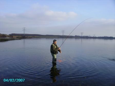 Een aantal mannen stond al klaar, waadpak aan en de vaste hengel in de hand….? Dit bleken zalmvissers te zijn die aan het oefenen gingen met hun 2-handige zalm hengels. Waadpak aan, hengels opgetuigd en aan de slag dan maar.
