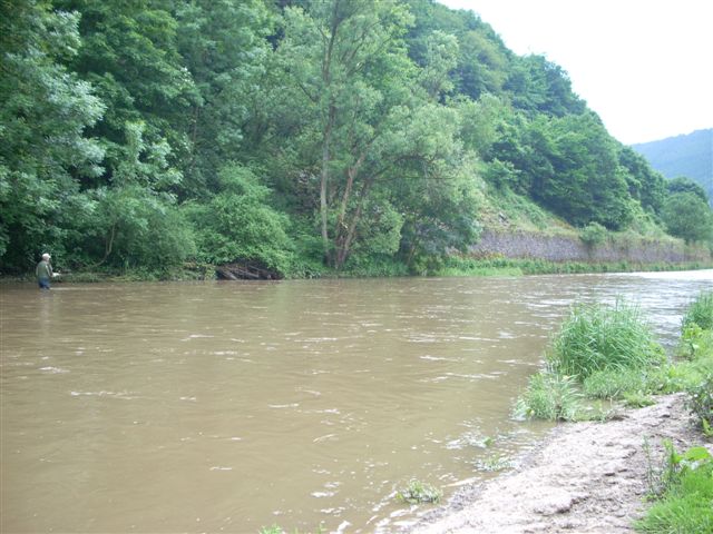 Zaterdag ochtend is er helaas weinig veranderd nog steeds erg bruin water, we besluiten om benedenstuws bij Vianden te gaan kijken, hier is het water wel helderder maar stroomt het zo vreselijk hard dat wadend vissen wel erg avontuurlijk zou worden. Tegen beter weten in gaan we bij de camping aan de slag met felle kleuren nimphen maar ondanks al onze pogingen hebben we niets meer weten te vangen.