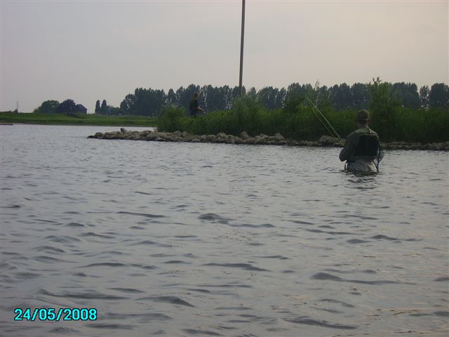Wel jammer omdat we hier met enige regelmaat de roofblei zien jagen. Als het al begint te schemeren besluiten we terug te lopen en zien we Willem, Jos en Rob ook druk aan het vissen. Rob heeft al snel met een goed geplaatste worp een visje tot het nemen van de nimf verleid. Nu het tijd is om naar huis te gaan zien we plotseling azende vis op het ondiepe deel tussen de kribben stijgen. Even overwegen we nog om de reeds afgetuigde hengels weer op te tuigen, maar we besluiten dan toch maar dat deze voor de volgende keer zijn!