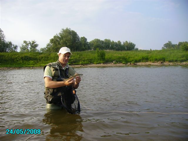 Even later is het dan toch raak een klein snoekbaarsje kon de verleiding niet weerstaan, nog wel even lastig landenmet zo`n lange leader maar hopelijk went dit snel.Helaas zien we verders geen aanbeten meer, Charlie, inmiddels ook even komen kijken (zonder hengel, kwam rechtstreeks van de opbouw van de Fly-fair af) adviseert nog om het even iets verder in het water te proberen om precies op de stroomnaad te kunnen vissen.