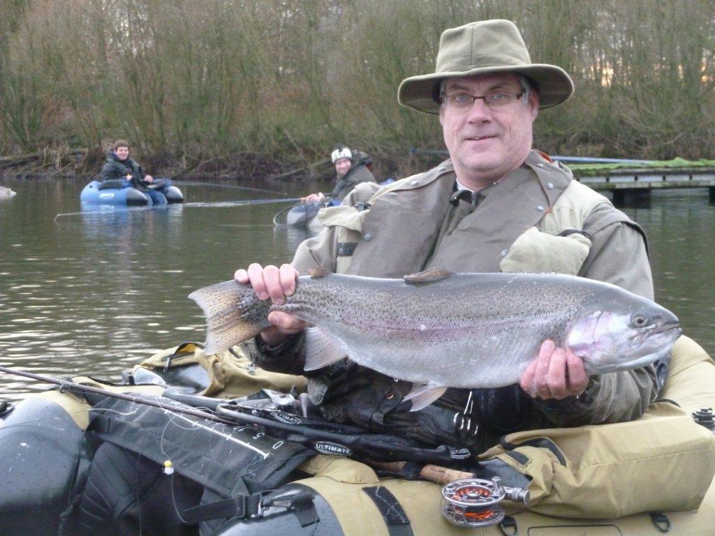 Na een spoed reparatie aan zijn flippers heeft Gerrit ook met de Belly-boat het water weer opgezocht, plots krijg ik een keiharde dreun op de witte Booby, mijn # 5 trekt tot in het handvat krom en de forel neemt meters lijn, na een zeer stevige dril weet ik de forel te landen met een grote grijns op het gezicht leg ik de rolmaat erlangs 75 centimeter één en al gespierde regenboog forel.