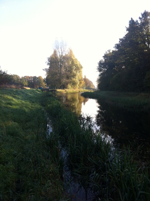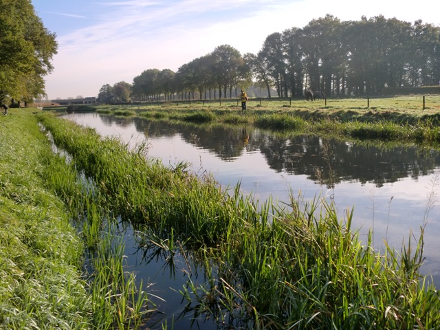 Na een poosje besluit ik het een eind verderop te proberen hier ligt het water in de schaduw van de bomen en staan er mooie graskanten waar ik wel snoek vermoed (volgens mij ligt die snoek er altijd wel alleen moeten ze wel willen bijten),