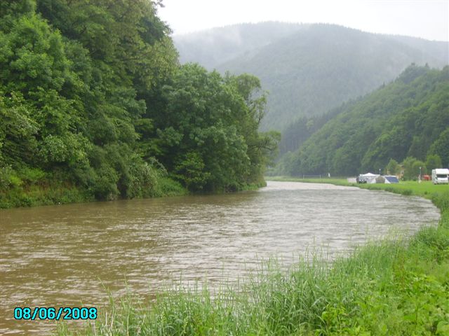 Na een mooie tocht aangekomen op de camping, hier staat Johan ons al met een brede grijns op te wachten, hij was al in Trier dus maar even doorgereden en al op donderdag avond aangekomen. Natuurlijk had Johan de 1e vissen al weer gevangen, maar ook het eerste natte pak was dit keer voor Johan, nee geen uitglijder maar de hele donderdag avond regen.