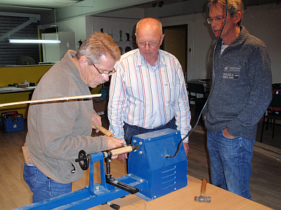 Onze splitcane Charlie had nog wat strips klaar liggen en had al winkelend met zijn vrouw een aantal blokken olijfboom hout op de kop getikt. Dit leek hem wel leuk voor de reelhouder. Johan toverde uit een kast een draaibank voor hout. Charlie liet maar weer eens zien van alle markten thuis te zijn.