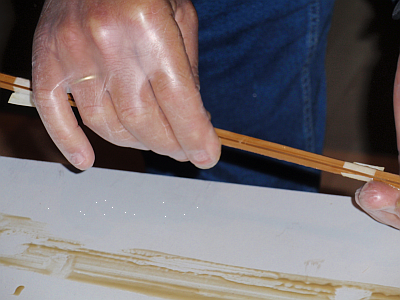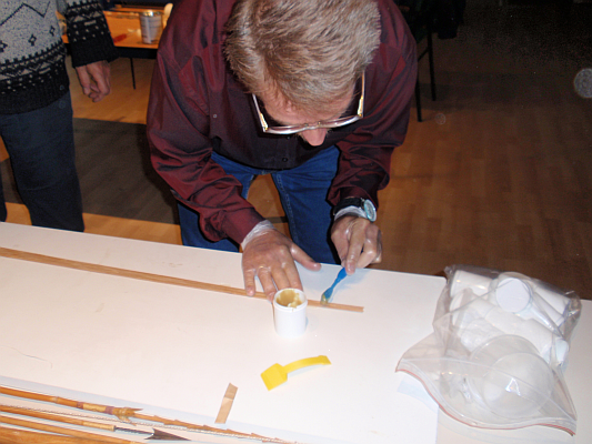 Onze splitcane Charlie had van een vorig sessie (enkel jaren geleden) nog wat kant en klare strips liggen en het leek hem een goed plan die nu maar eenst te lijmen. Nadat de strips met tape netjes bijelkaar gebonden zijn is de tape voorzihtig aan 1 kant doorgesneden zodat de strips nog steeds goed liggen en na het lijmen weer netjes in elkaar gezet kunnen worden.