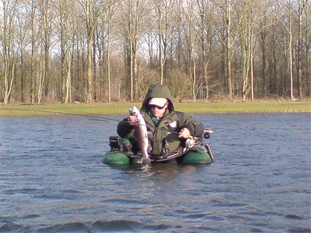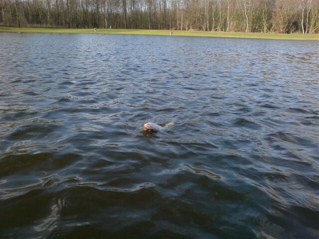 Dus het door Jan aangeboden kopje koffie zo heet mogelijk genuttigd, Belly-boat opgeblazen, de hengel opgetuigd en snel naar de vijver. Hier zie ik dat ik niet de enige ben die snel aan de slag wil, Charlie heeft inmiddels het ruime sop al gekozen.