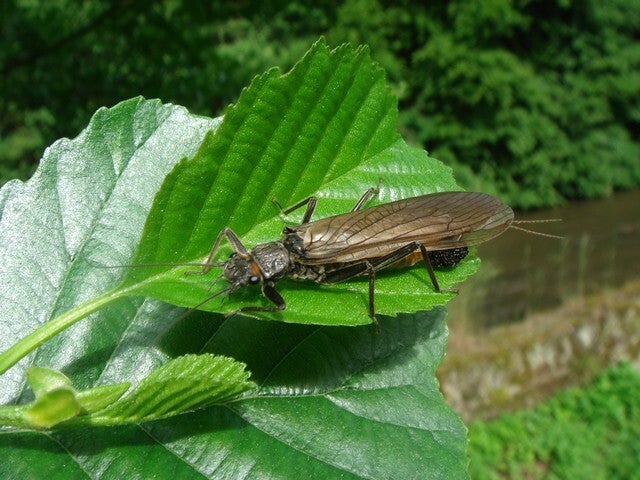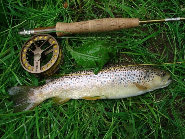 Ondertussen had Marcel voor iedereen een vergunning gehaald zodat we meteen konden beginnen met vissen. Het water was wat bruinig van de afgelopen dagen regen maar omdat de vooruitzichten goed waren hadden we goede vertrouwen in een mooi weekend. Omdat ik vorige jaar een leuk stekje gevonden had, na het zwembad, wilde ik het daar eens proberen. Het vissen verliep wat moeizaam omdat je vaak nog geen goed zicht hebt op het insectenleven. Maar omdat de zon goed door kwam vlogen er al snel mooie Ephemera danica’s rond en kleine zwarte sedges. Ik kon mij vorige keer nog goed herinneren toen ik met zeer veel moeite mijn vlieg pal tegen een afgekalfde oever, onder een boom, heb laten drijven. Deze werd toen met veel geweld gepakt door een grote bruine forel.