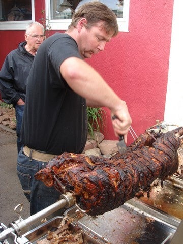 Zonder kleerscheuren kwamen we aan op de Camping van Kyllburg waar Yke net een beetje wakker aan het worden was. Na elkaar begroet en bijgekletst te hebben werden de tenten opgezet en spullen klaargemaakt. Terwijl we een mooi kamp aan het opzetten waren, hoorden we muziek en luid gefeest van de andere kant van het camping veldje. Een groep Amerikanen waren bezig met ontstressen. Volgens Johan en Yke waren ze zo de hele nacht al bezig om ieder uit hun slaap te houden. Dat zag er niet goed uit voor komende nacht. Inmiddels was Roger erbij komen zitten om een voorstel voor het avond eten van morgen te doen. Hij was van plan een speenvarken aan het spit te rijgen en vroeg of we daar interesse in hadden. Natuurlijk! Naast dat het een imposant gezicht is was ik ook wel benieuwd naar de smaak.