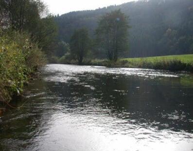 In september werd er door 3 leden van de VVMN gevist op een aantal verschillende strecken van de Kyll, in de omgeving van Gerolstein. Met name het stuk rond het zeer bekende plaatsje Birresborn was gedurende het jaar zeer druk bevist door met name Hollandse vliegvissers (volgens de Fam. Görres van hotel Zur Krone). Ook in het weekeinde dat wij er waren, was het druk aan de waterkant. Het weer was ons welgezind, en op de eerste dag hebben wij het deel van het parcours stroomopwaarts van het dorp bevist. Stijgende vis was schaars, alleen strak langs de oever werden af en toe head-and-tail azende vissen gespot. Deze vissen waren alleen vangbaar met dunne leaderpunten (10/00) en kleine droge vliegen en emergers gebonden op haakje 20 of kleiner. Dat er vis in overvloed aanwezig was werd al snel duidelijk toen de droge vlieg werd ingewisseld voor verzwaarde nimfen..... mooie en gezonde bruine forellen en vlagzalmen konden deze traktatie maar moeilijk weigeren!